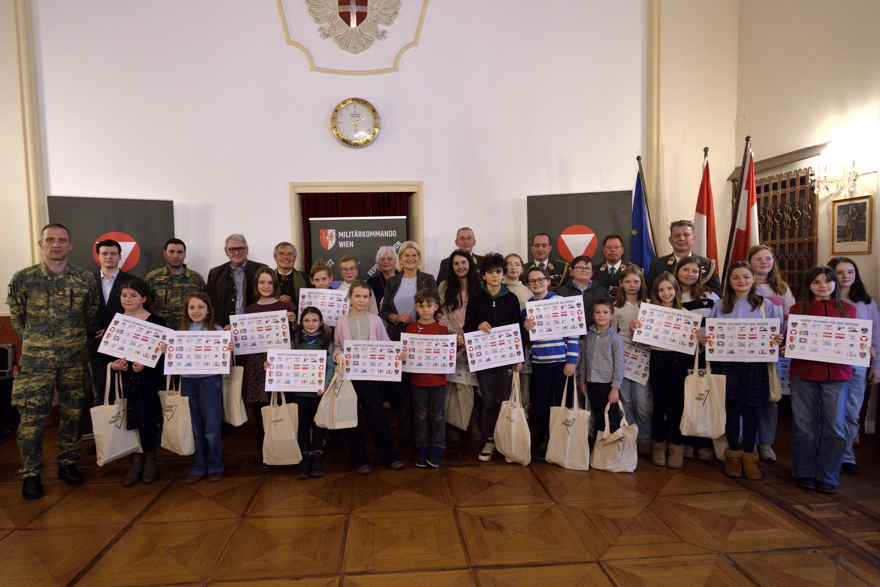 „Ich werde von meiner Seite alles dafür tun, dass es diese so wichtige Aktion auch in Zukunft gibt, weil es nichts Wichtigeres gibt als den Frieden zu erhalten oder wieder zu schaffen! Ihr seid unser aller Zukunft, ihr seid diejenigen, die mit diesen künstlerischen Werken die Macht habt, auch ein Stück weit dieses Friedens zu bringen!“, betonte Verteidigungsministerin Tanner, die im Jahr 2025 den Ehrenschutz für diese Traditionsaktion übernommen hatte. Es sei für sie eine große Ehre und Freude, heute hier zu sein. Im Beisein des Initiators der Aktion „Kinder zeichnen für den Frieden“, Regierungsrat Willibald Authried, überreichten Bundesministerin Tanner, gemeinsam mit dem Militärkommandanten von Wien, Brigadier Kurt Wagner, die fertigen Druckbögen den jungen Künstlerinnen und Künstlern im großen Festsaal des Garnisonskasinos der Maria-Theresien-Kaserne.