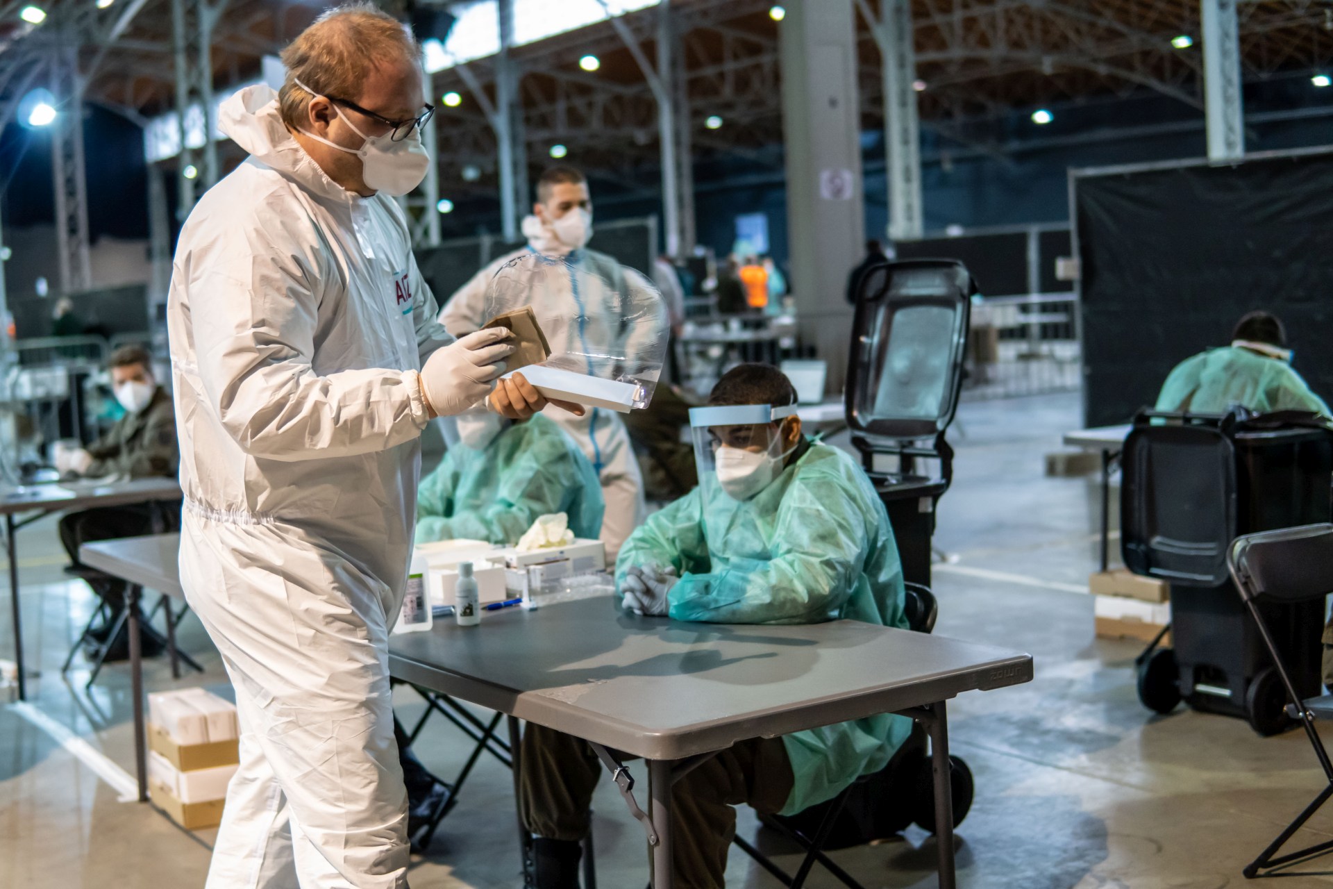 Unter den 350 Mitarbeitern der Marx-Halle sind auch 16 Soldaten der Wiener Miliz, davon vier Sanitäter und zwei Ärzte. Sie haben sich freiwillig für den Testeinsatz gemeldet. Zugsführer Lukas Ö. ist einer von ihnen. "Ich wechsle gerade von Salzburg in ein Krankenhaus nach Wien und hatte Zeit. Da war klar, dass ich mich melde", erzählt der angehende Chirurg. In einem weißen Schutzanzug, geschützt durch Einweghandschuhe, Maske und Gesichtsschild, nimmt er die Proben und gibt sie an die Auswerter weiter. Nach 15 Minuten haben die Testpersonen Gewissheit – zumindest bei einem negativen Ergebnis. Ist der Schnelltest positiv, bringt ein Soldat die Testperson zu einer der PCR-Teststationen. "Der Schnelltest kann bei positiven Ergebnissen eine Fehlerquote von 50 Prozent haben. Mit dem PCR-Test wissen es die Personen dann sicher", sagt der Miliz-Arzt.