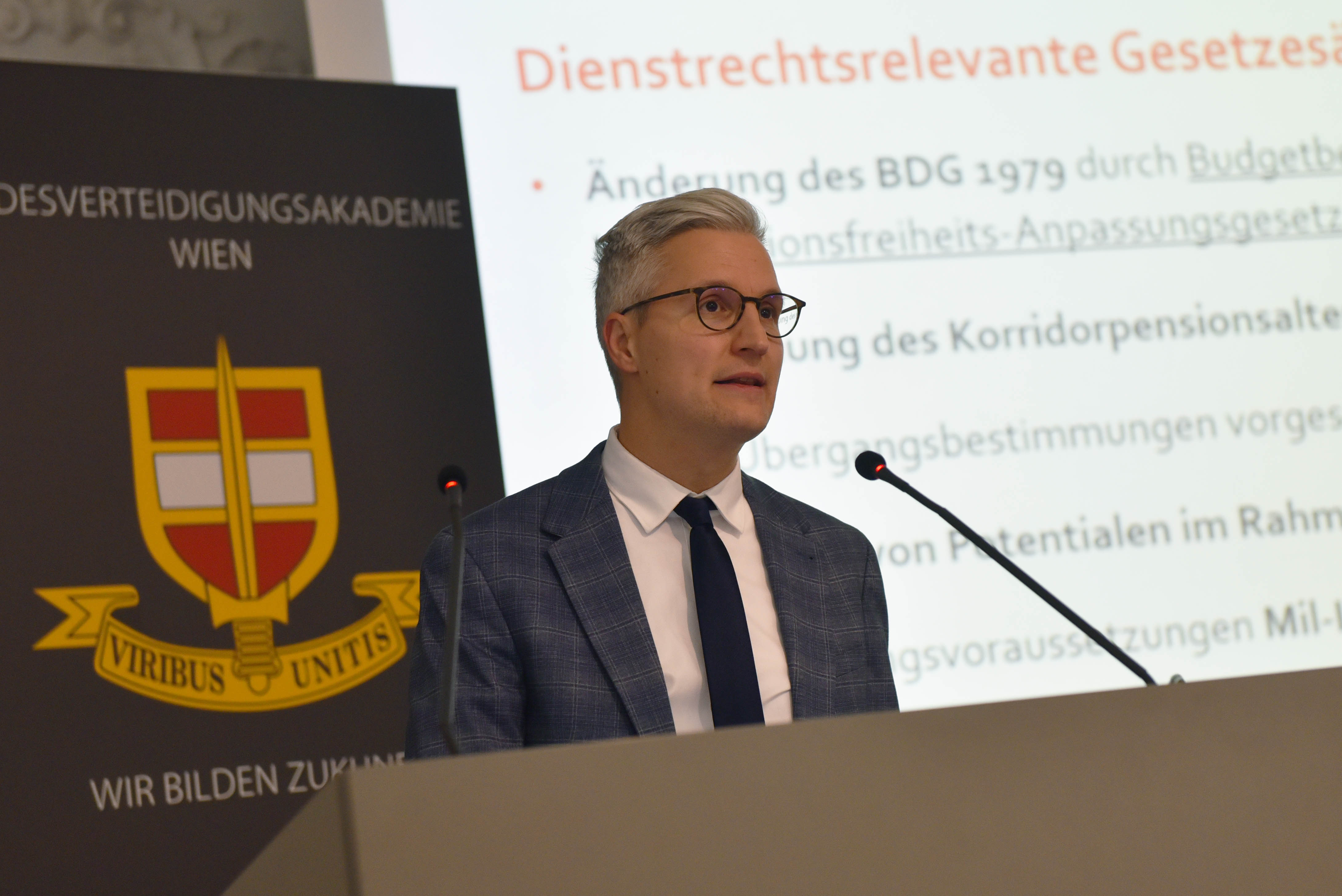 Zum Abschluss präsentierten Abteilungsleiter Smutek und Oberst des Generalstabsdienstes Heinold Maßnahmen zur Bewältigung personeller Herausforderungen. Im Mittelpunkt standen die Gewinnung qualifizierter Fachkräfte und die Attraktivitätssteigerung innerhalb des Österreichischen Bundesheeres.