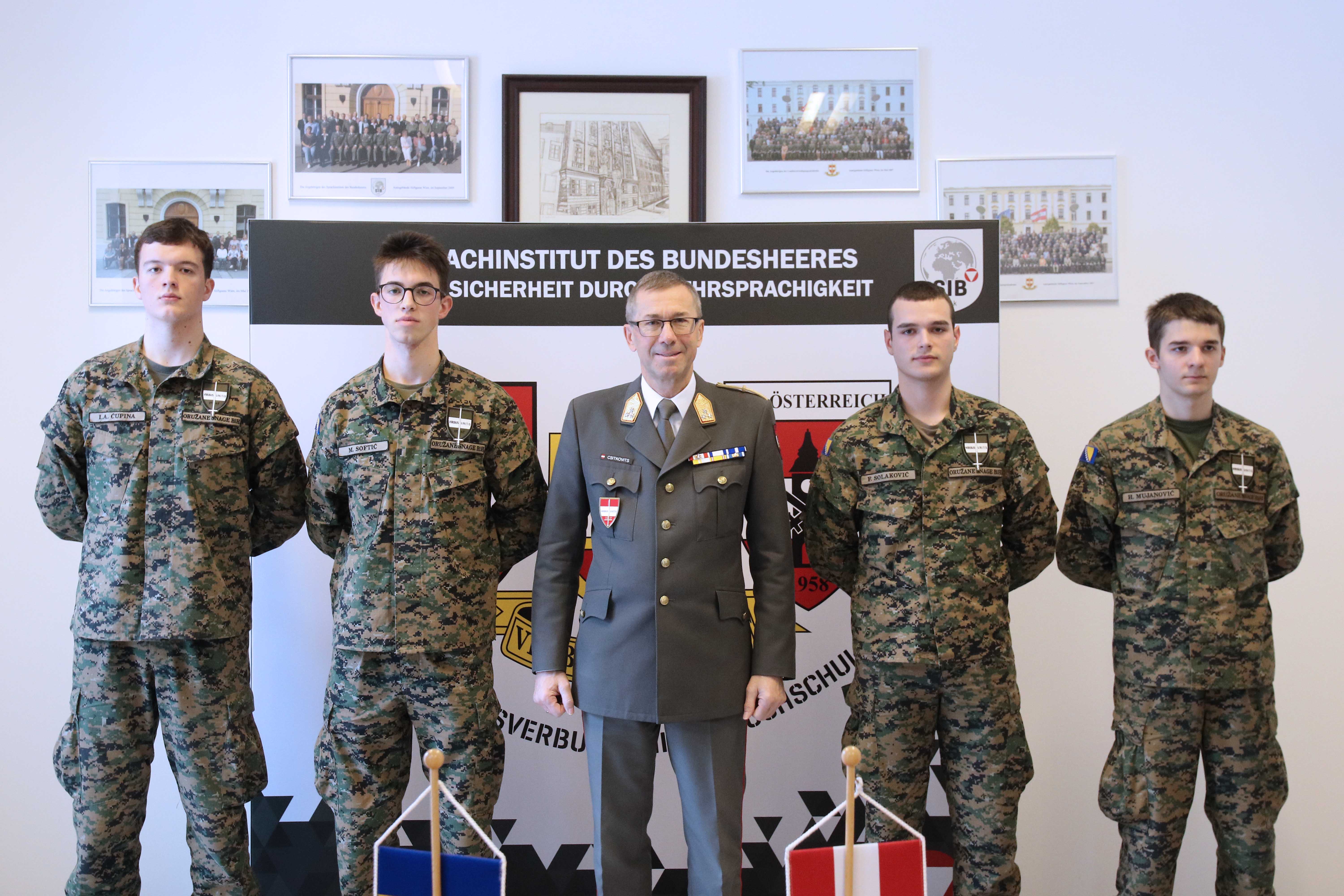 Eine besondere Ehre wurde vier internationalen Offiziersanwärtern aus Bosnien am vergangenen Montag, 24.11.2025, zuteil, als sie das Truppenkörperabzeichen vom Kommandanten der Landesverteidigungsakademie Generalleutnant Erich Csitkovits verliehen bekamen. In Anwesenheit des Leiters des Sprachinstituts des Bundesheeres, Oberst Thomas Fronek und des Lehrpersonals, drückte der Akademiekommandant bei diesem Anlass seine Freude darüber aus, dass die angehenden Offiziere aus Bosnien durch ihre Teilnahme an der vorbereitenden Sprachausbildung temporär Teil der Landesverteidigungsakademie sind und diese Zugehörigkeit nunmehr auch mit dem Tragen des Truppenkörperabzeichens zeigen können.