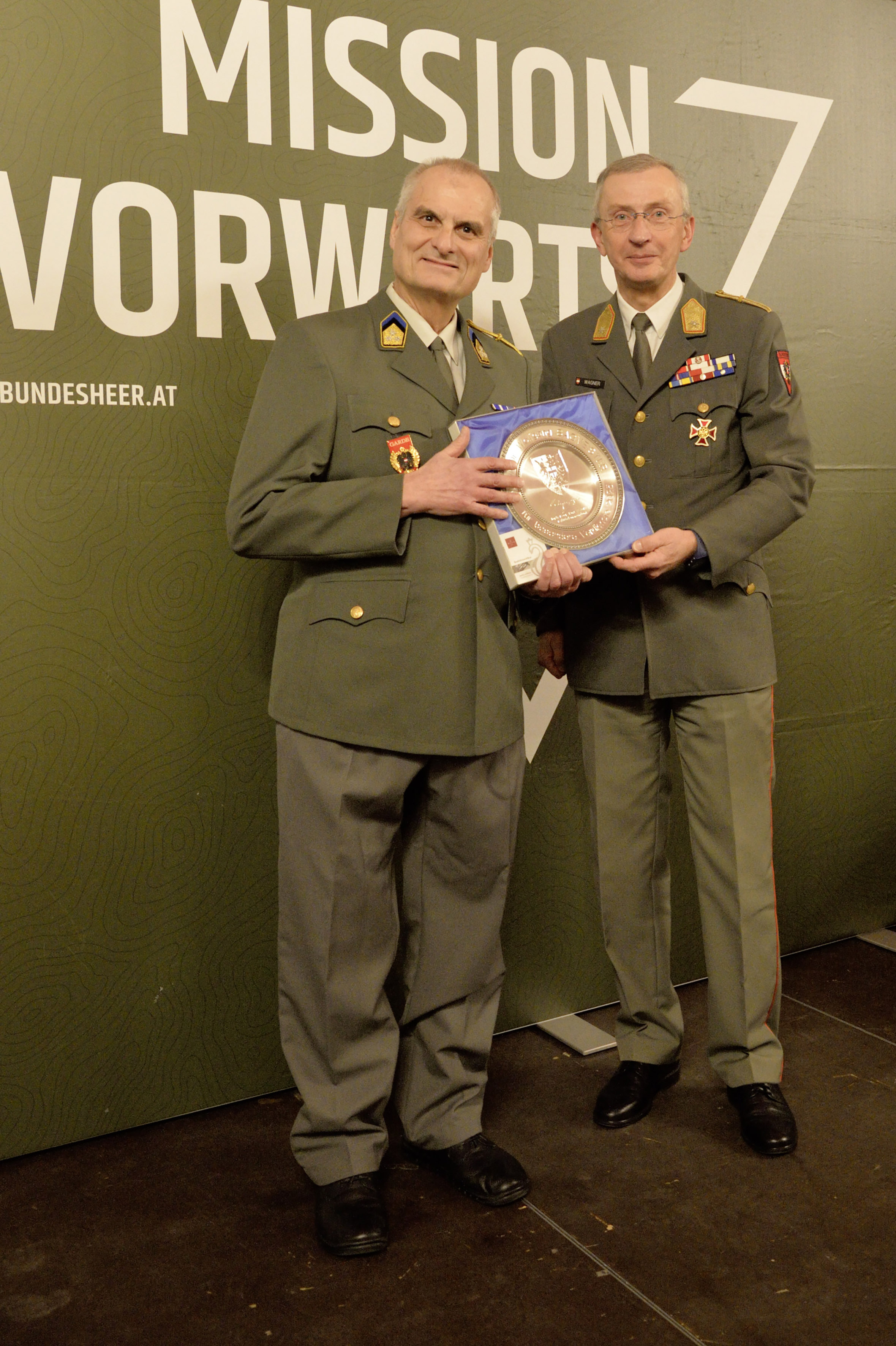 Brigadier Wagner überreichte den „Silberteller des Militärkommandos Wien“ an Oberstarzt Dr. Wolfgang Sagmeister.