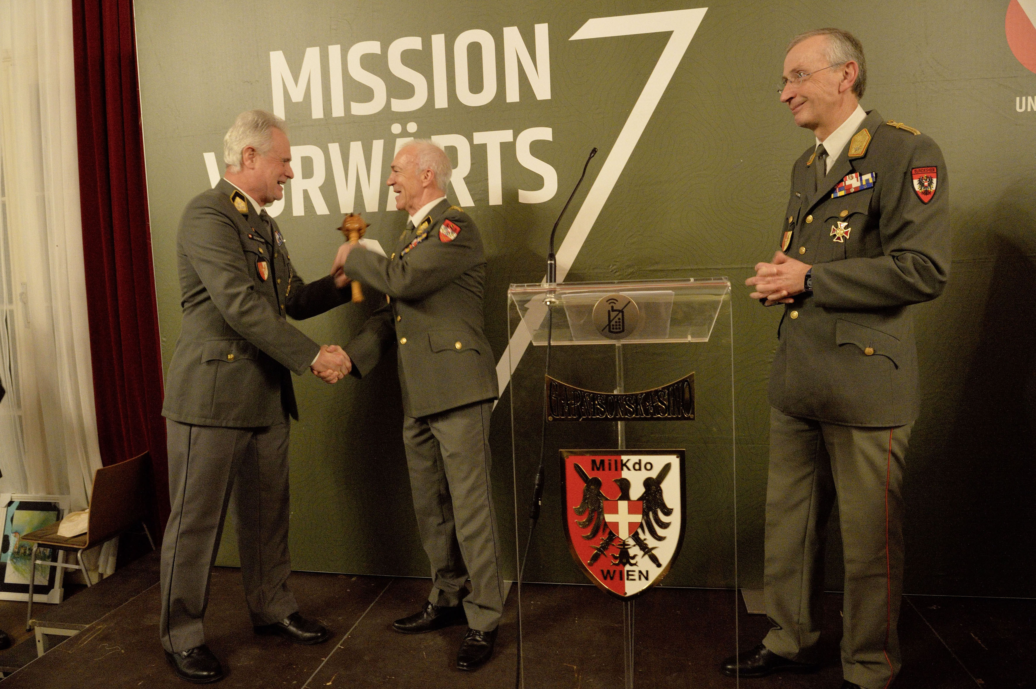 Nach vier Jahren verantwortungsvoller Tätigkeit als Leiter der Stabsarbeit und stellvertretender Militärkommandant von Wien, darf Oberst Leopold Schieder nach mehr als 45 Dienstjahren seinen wohlverdienten Ruhestand antreten. Als sichtbares Zeichen der Übernahme der Agenden der Stabsarbeit erhielt Oberst Albert Bauer den hölzernen Stab des Militärkommandos Wien von Oberst Schieder.