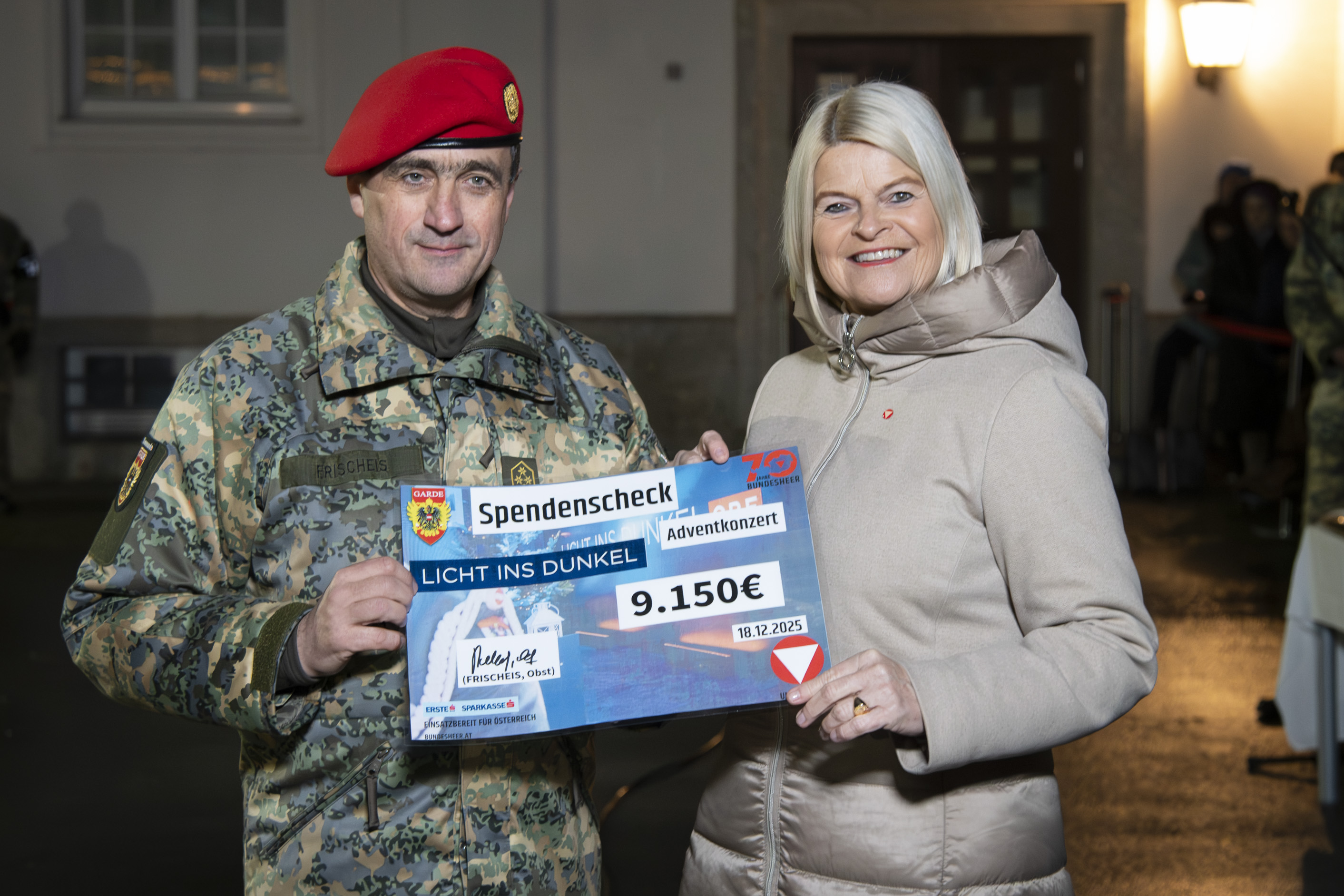 Im Rahmen der Veranstaltung wurde zudem der Reinerlös des Adventkonzerts der Gardemusik in Höhe von 9.150 Euro symbolisch an Bundesministerin Tanner übergeben. Der Betrag kommt im Zuge der Spendengala von „Licht ins Dunkel“ am Heiligen Abend bedürftigen Menschen zugute.
