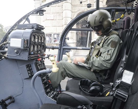 Ein Pilot in seinem Hubschrauber vor dem Burgtheater.